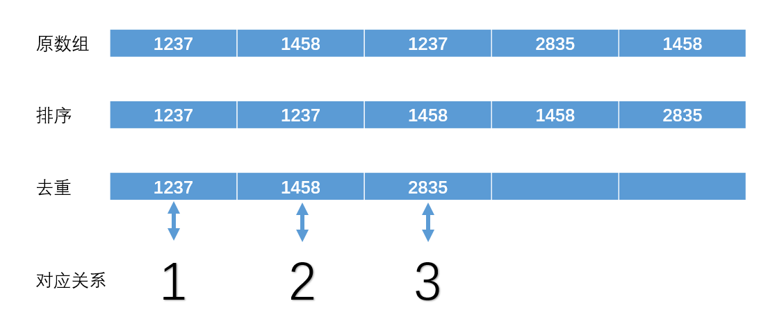 例如:对集合 进行离散化操作。我们只需进行排序和去重的两步操作,便可以完成离散化。