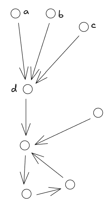 在修改节点的代价一样的条件下,我们可以贪心的对更有价值的点进行修改,对于边 iA[i]i \rightarrow A[i],要么节点 ii 为黑色,要么节点 A[i]A[i] 为黑色, 在上图表示的情况下,对于边 ada \rightarrow dbdb \rightarrow dcdc \rightarrow d,将 dd 染为黑色的成本最低。由此,我们给出下面通过拓扑排序实现的贪心策略: